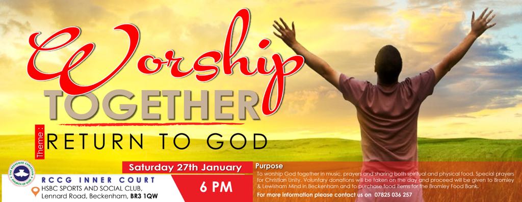 HSBC Sports and Social Club HSBC Sports and Social Club, Lennard Road, Beckenham, London, United KingdomThe aim is to worship God together in music, prayers and sharing both spiritual food and physical food.There will be a special prayers for Christian Unity.Donation will be taken on the day and proceed will be given to Bromley & Lewisham Mind in Beckenham and to purchase food items for the Bromley Food Bank.